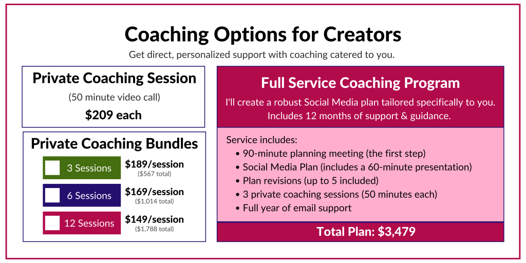 Coaching programs are personalized to the individual Creator. I really take the time to get to know you and your goals. During each session, we discuss ideas to help you better reach your goals on Social Media and answer any questions you might have (this can even extend to questions about branding, marketing, budgeting, monetizing, or anything else you need support with as a Creator). I come prepared in each session to talk about you, having researched your latest Social Media activity.
